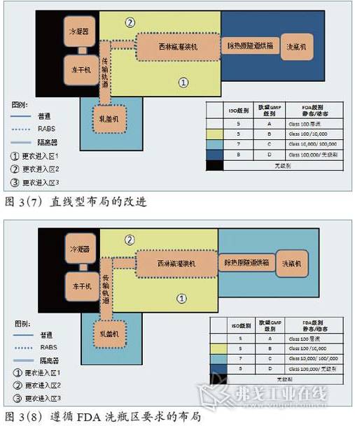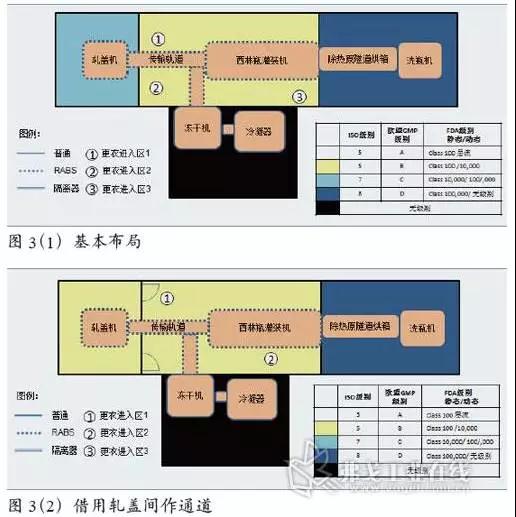 由于所有設(shè)施均在一個房間,在生產(chǎn)方面具有很好的聯(lián)通性。通過對環(huán)境要求的降低,也節(jié)約了能耗和運(yùn)行成本。在環(huán)境控制和相互影響方面,例如除熱原隧道烘箱帶來熱量的發(fā)散、從房間抽取空氣帶來的新風(fēng)補(bǔ)充問題,以及洗瓶機(jī)帶來的濕度控制問題等,需在設(shè)計(jì)中妥善考慮,但不在本文的討論范圍。