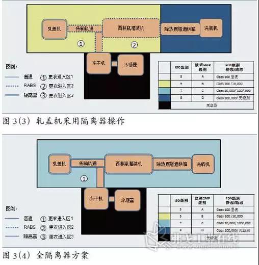 在這個方案中,對從除洗瓶機(jī)之外整條灌裝生產(chǎn)線采用隔離操作器。整個背景至少保持D級環(huán)境,見圖3(4)。隔離操作器的采用,本身也更適用于前述的激素類、高致敏性、毒性類的產(chǎn)品,由于隔離器的隔離保護(hù)較RABS更徹底,因此對高附加值、高質(zhì)量要求的產(chǎn)品來說也是較好的選擇。